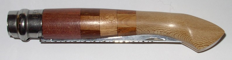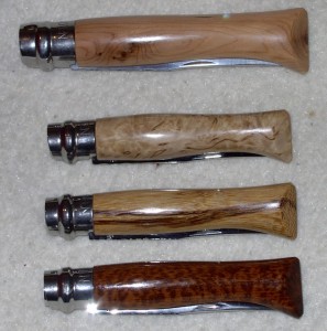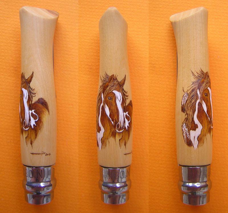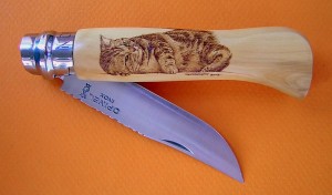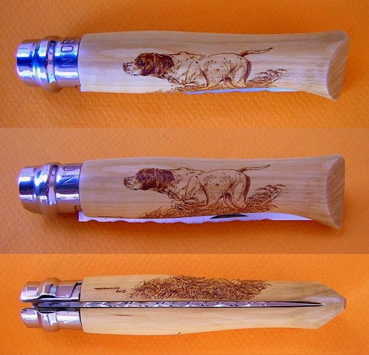 Voici trois Opinel customs en buis que j’ai confiés à Christian CAMBOULIVES pour qu’il réalise une pyrogravure avec sa technique personnelle qui se rapproche du scrimshaw. Il y ajoute selon le cas de la couleur. Lames inox guillochées. Place aux photos.