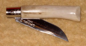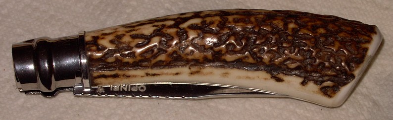 Un Opinel custom N°9 en bois de cerf avec un insert en aluminium qui joue le rôle de garde, pour une prise en main plus sûre.