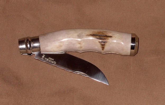 Un N°9 en bois de cerf poli, avec des empreintes pour les doigts qui améliorent la prise en main mais surtout un talon en inox tourné qui peut être personnalisé par la gravure des initiales de son propriétaire. Il conserve son côté utilitaire avec une touche d’élégance supplémentaire.