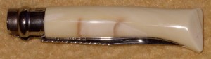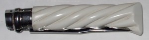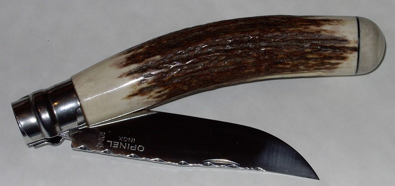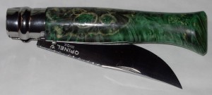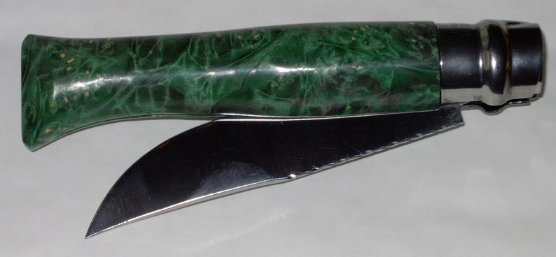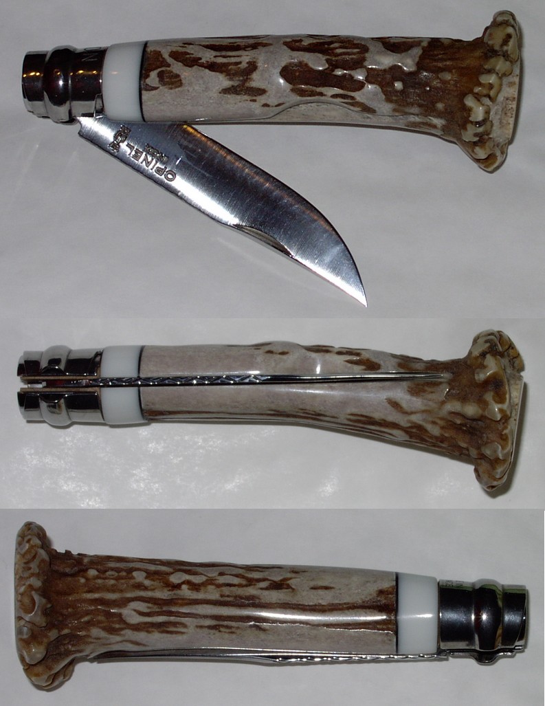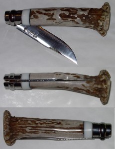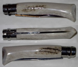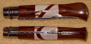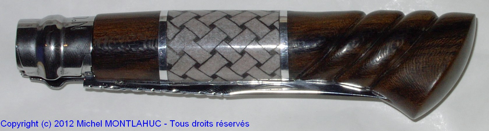 Je vous présente le projet que j’ai réalisé pour le livre commémoratif des 20 ans de Mercorne, le fournisseur de matériaux pour la coutellerie. J’ai reçu un carrelet de ziricote. Après quelques croquis pour tester différentes idées, j’ai choisi d’y ajouter des intercalaires en aluminium et une pièce centrale en bois de renne. L’ensemble a été tourné, rainuré puis ajusté. L’intérêt du bois de renne était de servir de support à un scrimshaw (réalisé par mes soins) dans le style Nordique : un tressage ajouré, réalisé au trait. Le talon est sculpté. Lame polie miroir guillochée. Voici un aperçu du résultat :